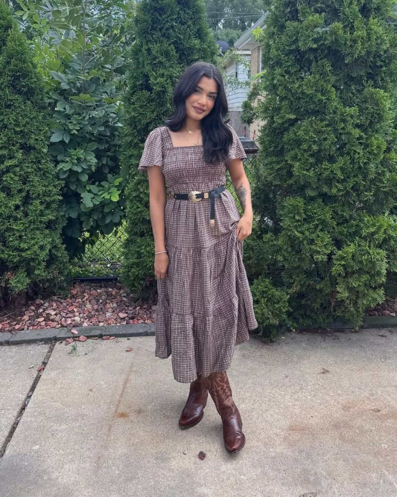 Brown plaid prairie dress with deep burgundy boots creates an earthy, fall-ready look. Soft textures maintain comfort and style.