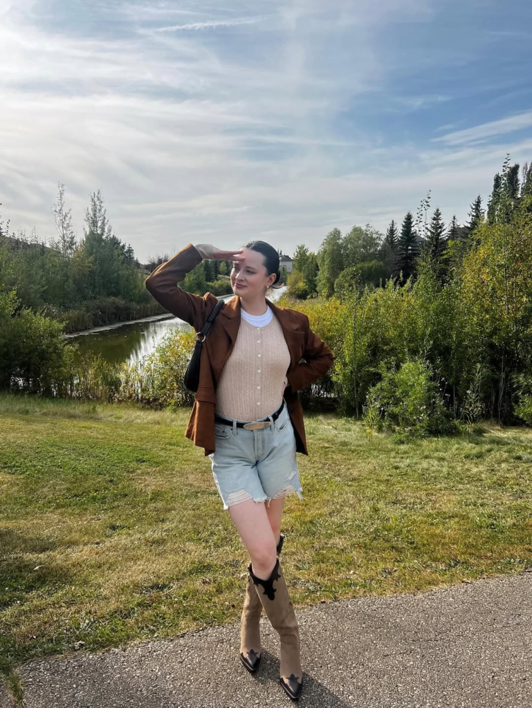 Blue denim shorts and a light denim shirt with brown knee-high boots create a timeless western casual look. Perfect for summer trips or concerts.