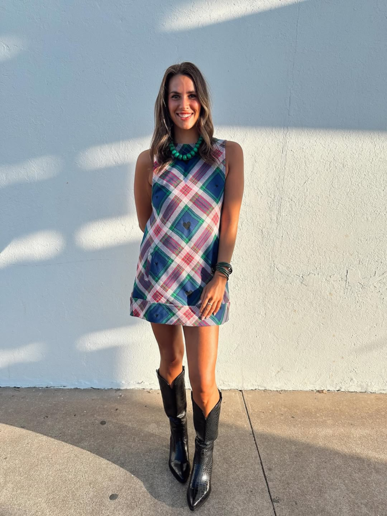20. Modern Plaid Mini Dress with Black Cowboy Boots