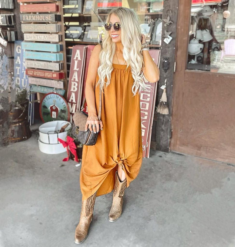 22. Relaxed Mustard Dress with Rustic Cowboy Boots