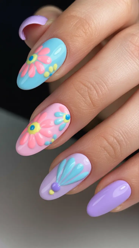I usually go for floral nails when I want something seasonal but still soft. This design uses pastel shades with daisy details that feel light and natural.
