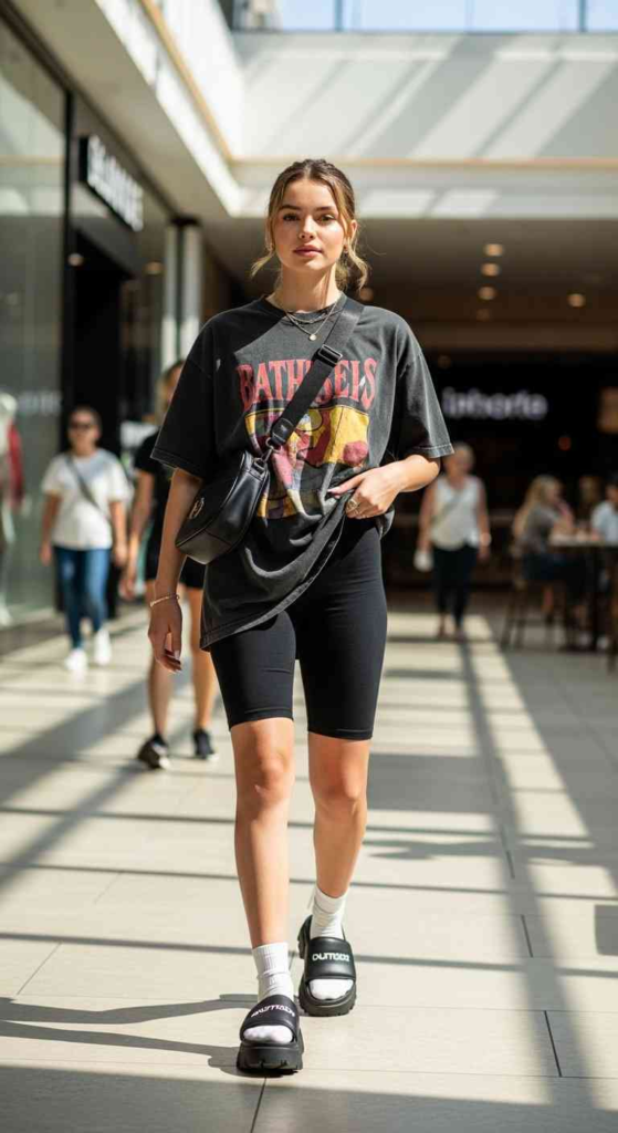 This look feels effortless and works for daily wear. Oversized tees are still huge in 2026, and pairing them with bike shorts keeps things balanced. It’s comfortable, breathable, and perfect for hot days.