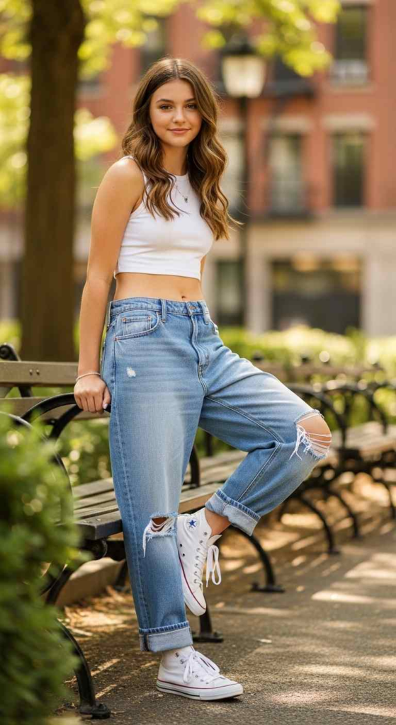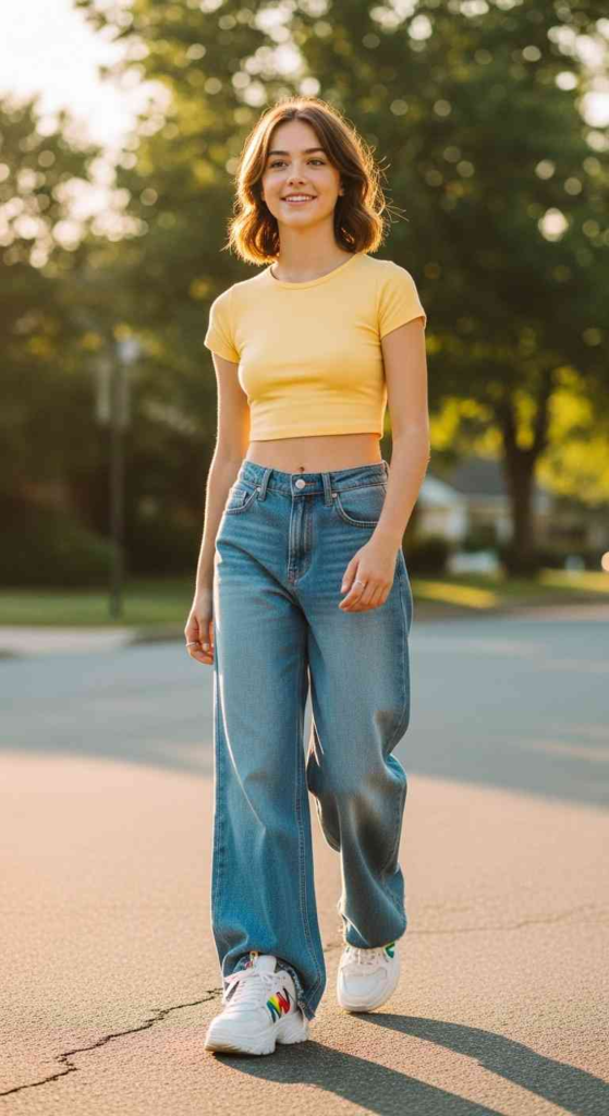 Baggy jeans are still leading teen fashion. A fitted baby tee balances the loose bottom, creating a simple but trendy look. It’s easy to style and works for casual outings.