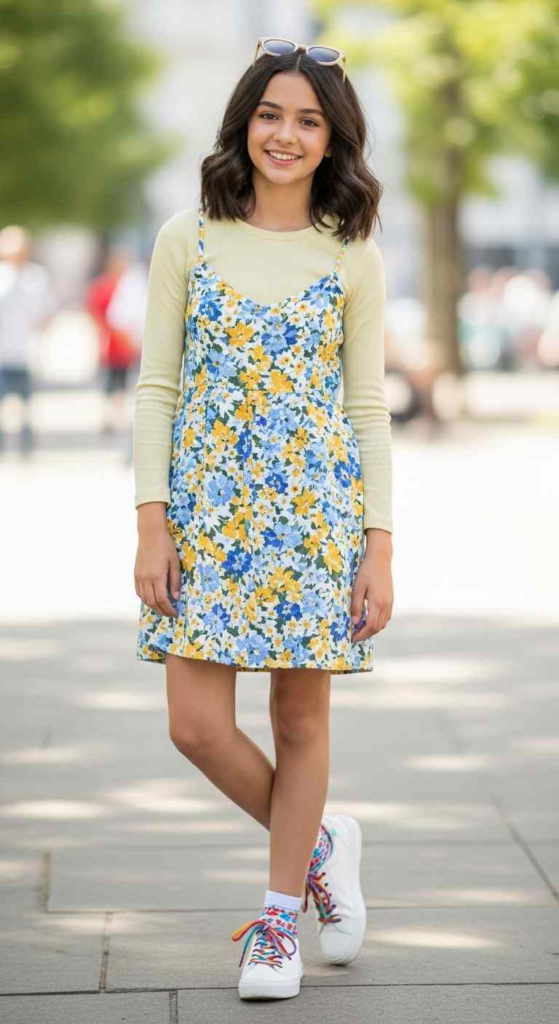 Adding a tee under a sundress gives a fresh layered look. It also makes the outfit feel more casual and wearable.
