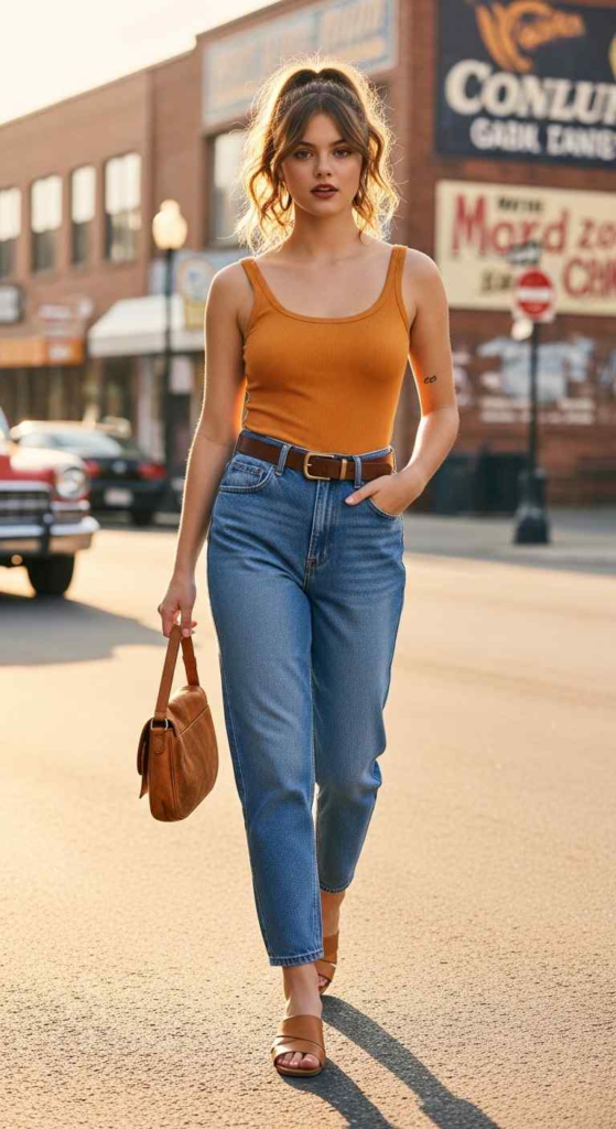 Mom jeans give a relaxed vintage vibe. A simple tank keeps the outfit light and clean.