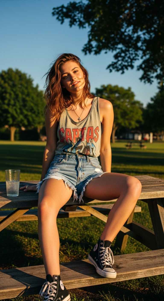 A bold tank top adds personality. Pairing it with denim shorts keeps things classic.