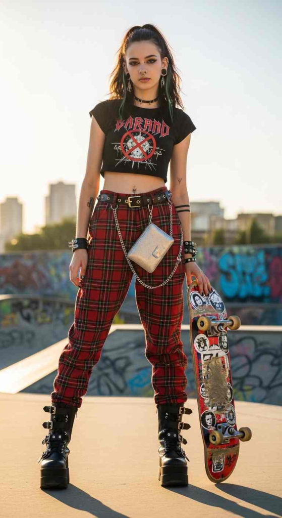 Plaid pants add a bit of edge. This look is great for teens who like something different from basic styles.
