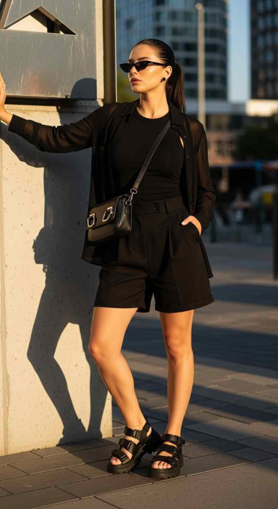 Wearing black in summer still works if fabrics are light. It creates a clean and bold outfit.