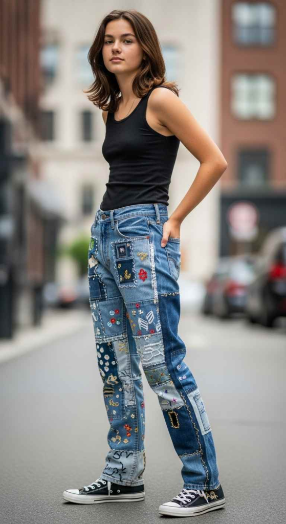 Patchwork jeans stand out and add personality. Keeping the top simple makes the outfit work better.