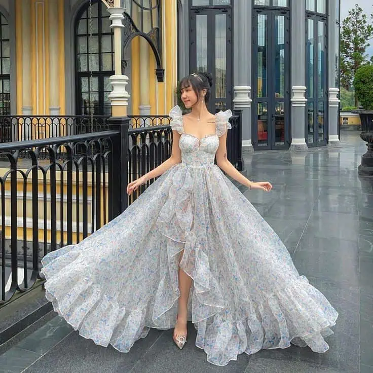 A flowing floral gown combines romance with comfort, featuring ruffled cap sleeves and a high-low hemline. The fitted bodice ensures a flattering fit while allowing free movement, perfect for a magical, dreamy prom look.
