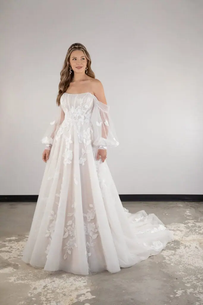 Off-shoulder gown with floral embroidery and sheer sleeves offers whimsy and comfort. A-line skirt allows dancing, while lace details and subtle sparkle elevate elegance for a relaxed yet sophisticated ensemble.