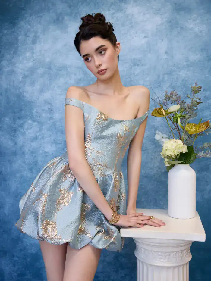 Blue mini dress with golden brocade pattern mixes elegance and ease. Off-shoulder bubble silhouette allows movement, and the shorter length keeps the wearer comfortable while looking glamorous.