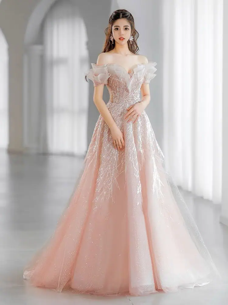 Off-shoulder pink gown with sparkly embellishments and billowing tulle skirt ensures movement and comfort. Ruffled sleeves and sweetheart neckline provide a cozy, chic look perfect for a dreamy prom night.