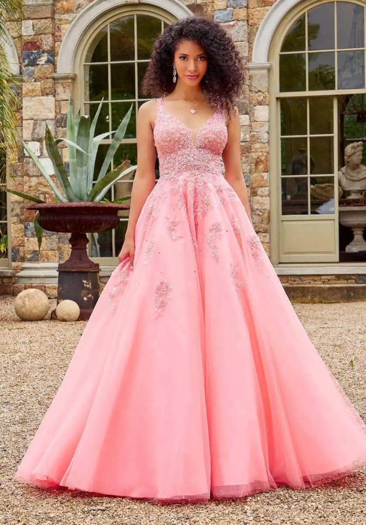 Soft pink ball gown with flowing tulle skirt and beaded bodice balances elegance and ease. V-neckline and sleeveless design allow unrestricted movement while maintaining a fairytale aesthetic for a magical prom experience.