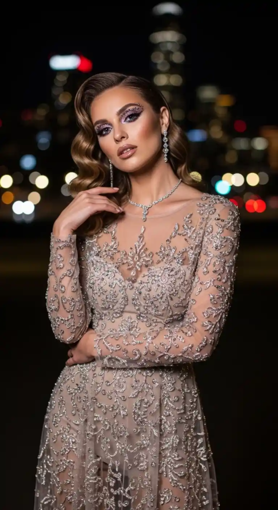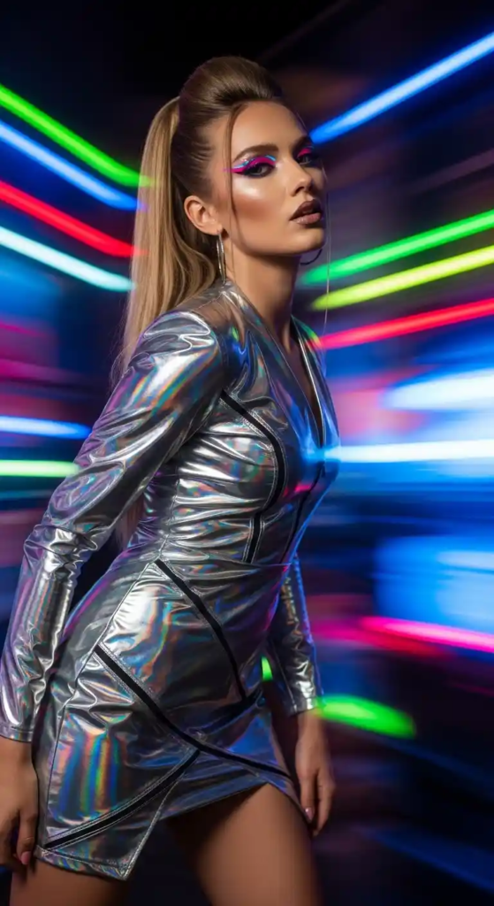 This is a nightlife-focused outfit. Metallic fabrics act like natural reflectors, increasing brightness under artificial lighting.