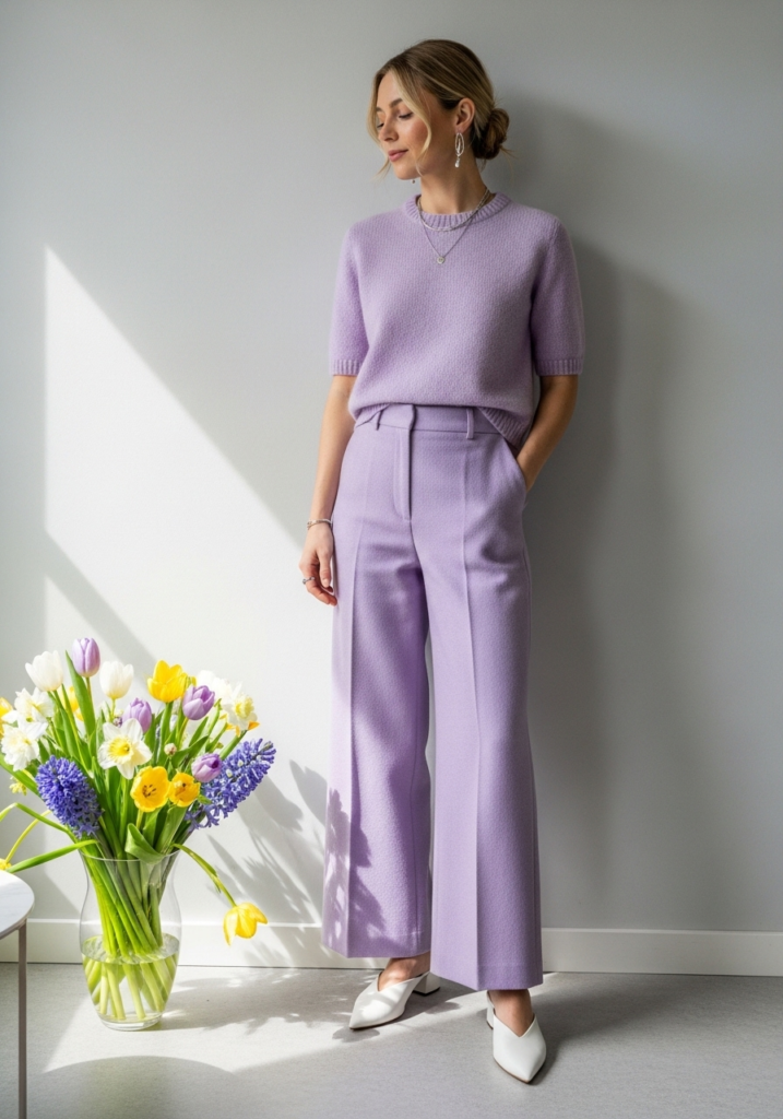 Not everyone wants to wear a dress, and I completely get that. Wide-leg trousers paired with a lightweight sweater can look just as elegant. Softer shades like lilac or sage green keep the outfit fresh for spring.
