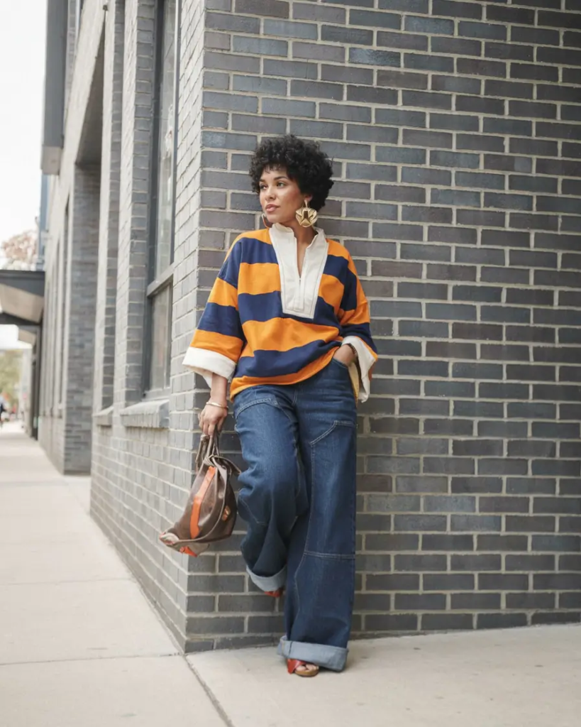 A striped rugby-style top paired with cuffed denim creates a relaxed sporty outfit. The look has a nostalgic feel while still appearing modern and easy to wear.