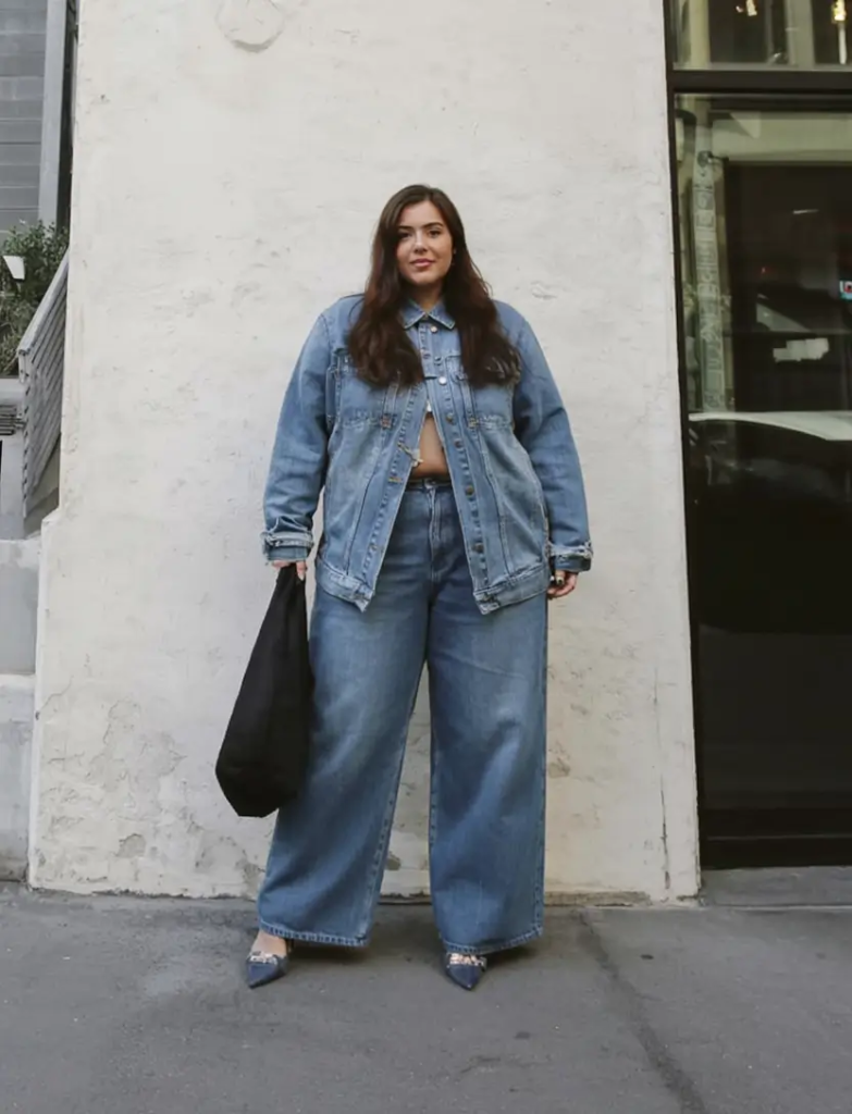 A denim jacket layered over a cropped top with wide-leg jeans creates a strong denim-on-denim combination. The silhouette feels modern because of the relaxed proportions.