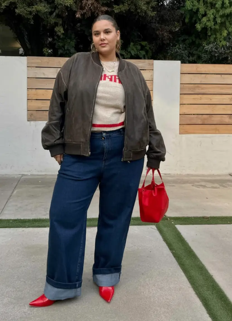 This outfit mixes a soft sweater, a bomber jacket, and wide-leg jeans. The neutral base is brightened by bold red accessories that add energy to the look.