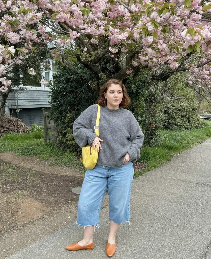 A grey oversized sweater tucked into denim Bermuda shorts creates a relaxed spring outfit. The balance between the heavier knit and lighter denim keeps the look comfortable.