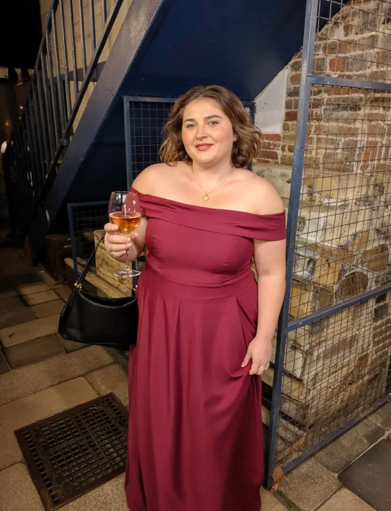 An off-shoulder gown in a deep berry tone creates an elegant evening look. The neckline frames the shoulders while the pleated waist adds gentle structure.