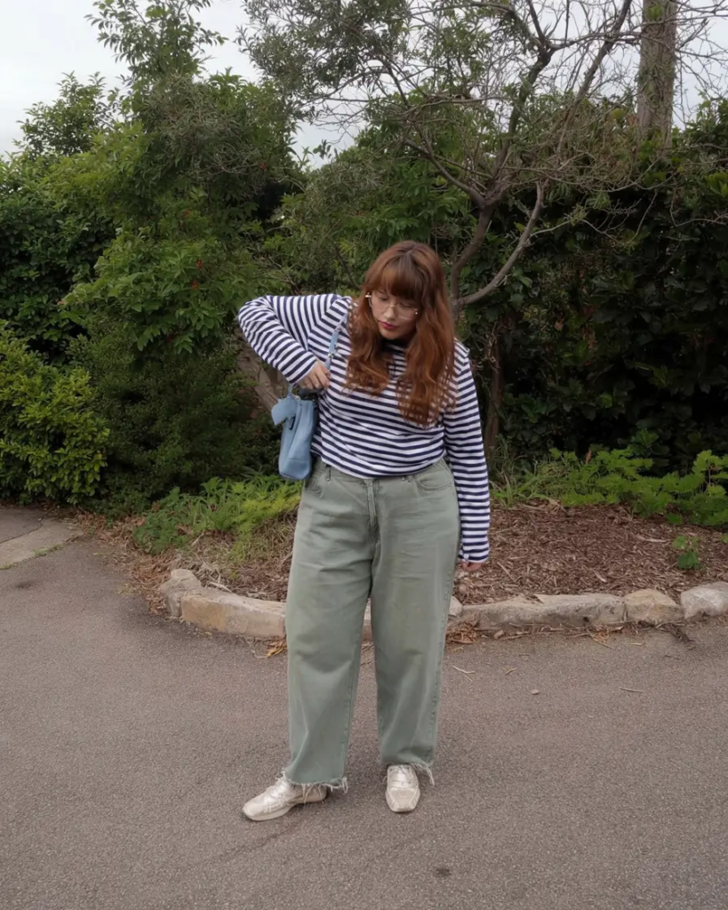 A classic striped top paired with sage-green wide-leg jeans gives this outfit a soft, fresh appearance. The colors keep the look calm while still feeling stylish.