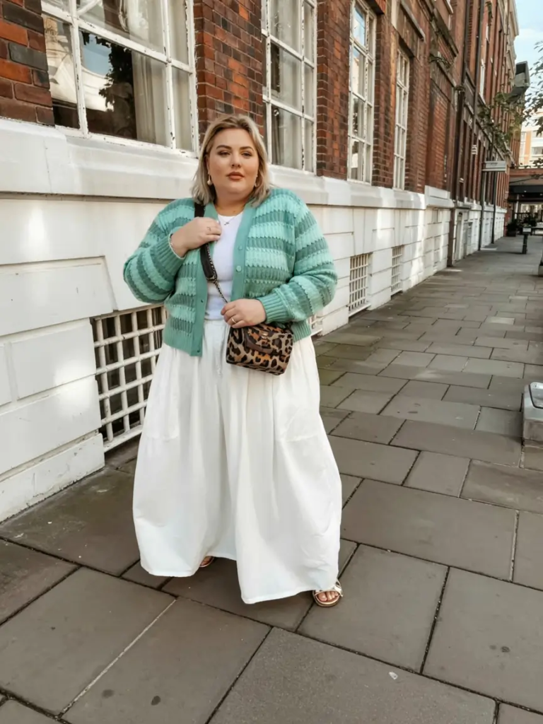 A voluminous white skirt combined with a mint cardigan creates an airy spring outfit. The flowing skirt adds movement while the cardigan provides shape.