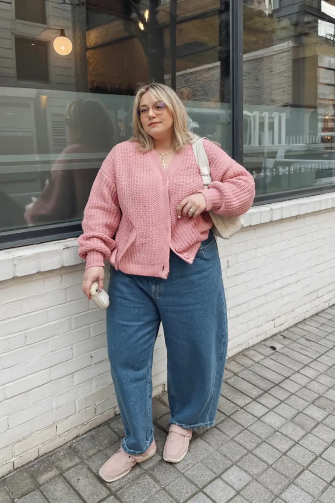 A blush-toned cardigan worn with loose denim creates a soft and cozy look. The pastel color adds warmth without feeling overly bright.