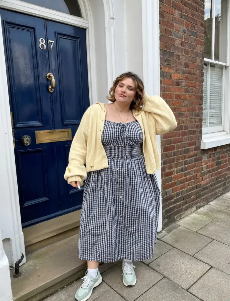 A gingham dress paired with a light cardigan creates a relaxed spring outfit with a nostalgic feel. The breathable fabric makes it comfortable for warmer days.