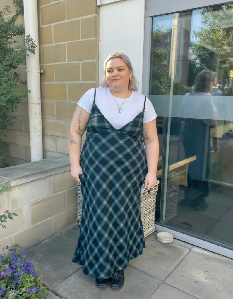 A plaid slip dress layered over a simple white tee turns a delicate piece into an everyday outfit. The tee makes the dress feel more casual and wearable.