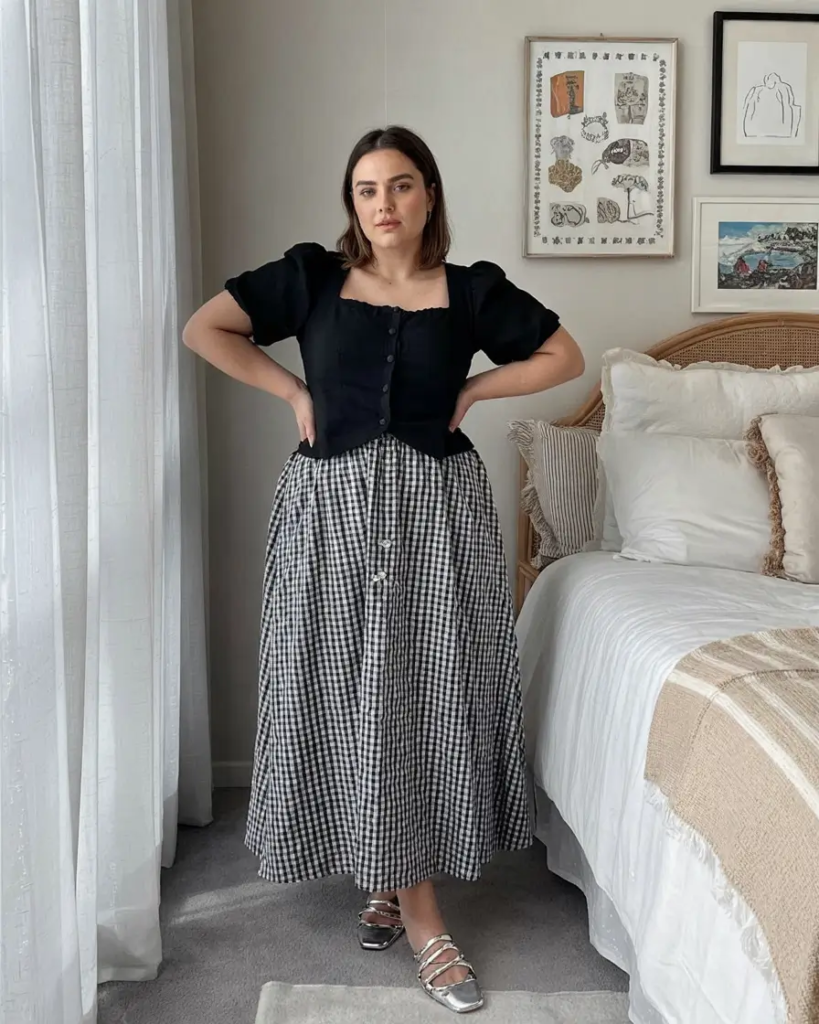 A fitted black top paired with a flowing gingham skirt creates a balanced silhouette. The top adds shape while the skirt keeps the outfit light and feminine.