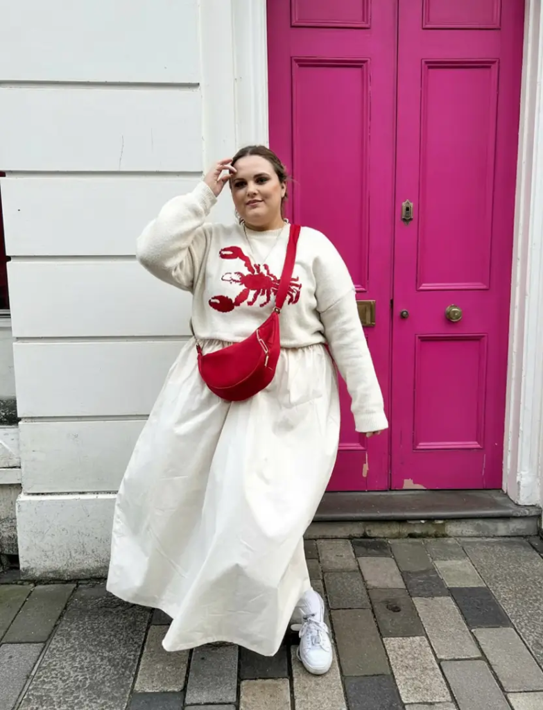 A light sweater paired with a flowing white skirt creates a breezy spring outfit. A red crossbody bag adds a bold pop of color.