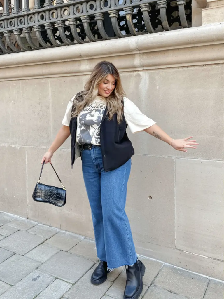 A graphic tee layered with a structured vest creates a stylish everyday outfit. Cropped jeans and boots add a slightly edgy touch.