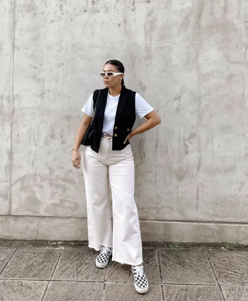 Light neutral tones combined with a black vest create a fresh spring outfit. Wide-leg pants add movement while the vest provides structure.