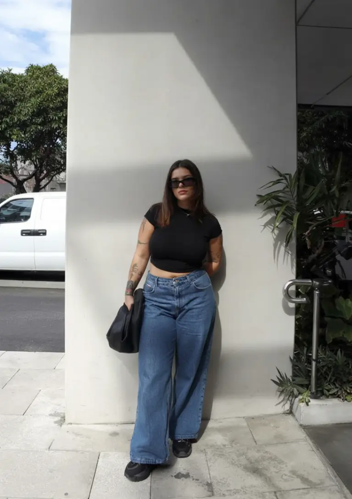 A fitted black crop top paired with wide-leg jeans creates a simple yet confident outfit. The clean lines highlight the relaxed shape.