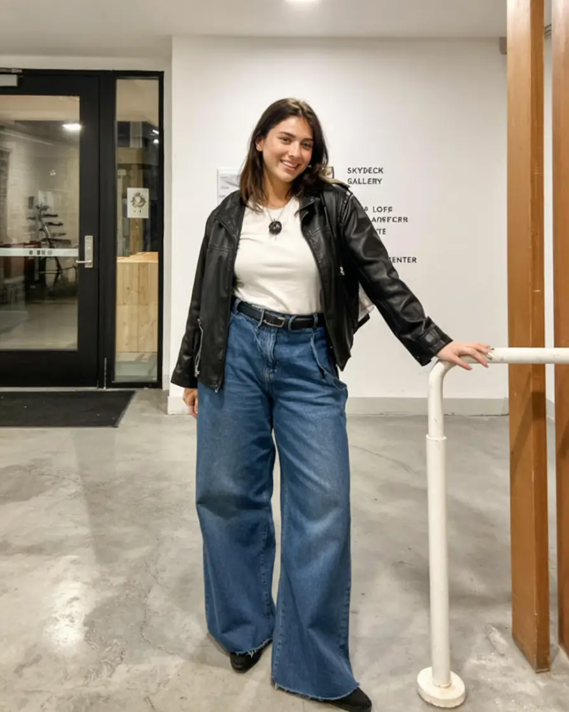 A leather jacket worn over a white tee and wide-leg denim creates a timeless outfit. The jacket adds structure while the denim keeps it relaxed.