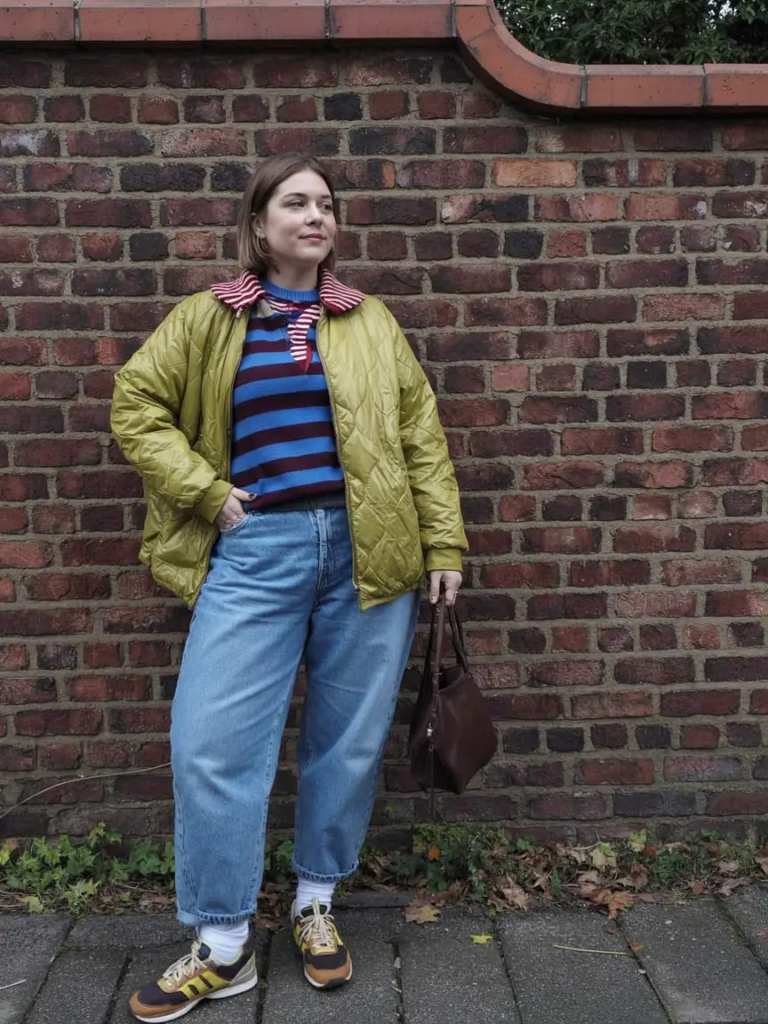 A striped top layered with a quilted jacket creates a colorful spring outfit. The patterns and layers add personality to the look.