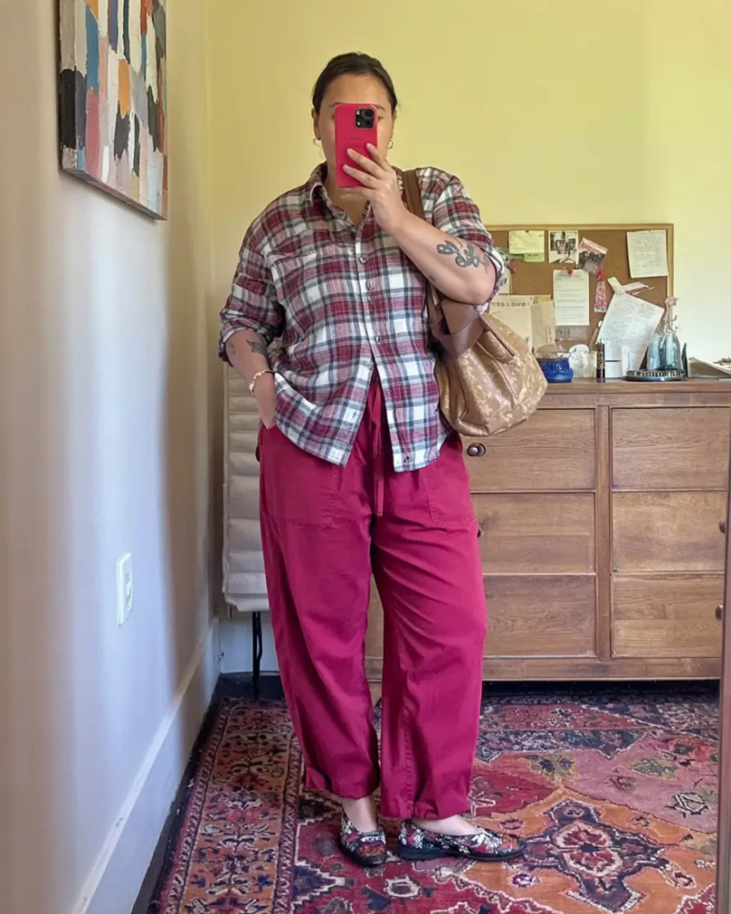 Deep red pants paired with a plaid shirt create a warm, earthy outfit. The relaxed fit makes it comfortable for everyday wear.