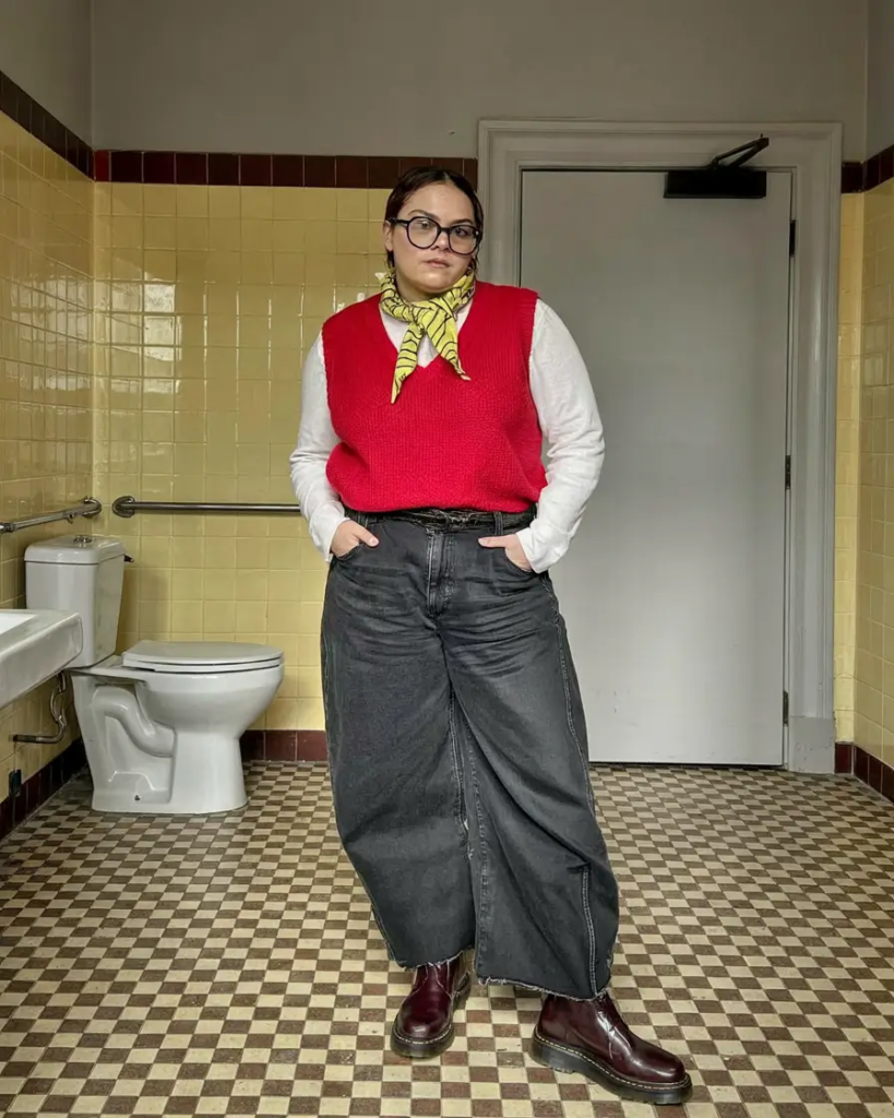 A red knit vest layered over a long-sleeve top and wide jeans creates a bold and confident outfit. A bright scarf adds an extra pop of color.