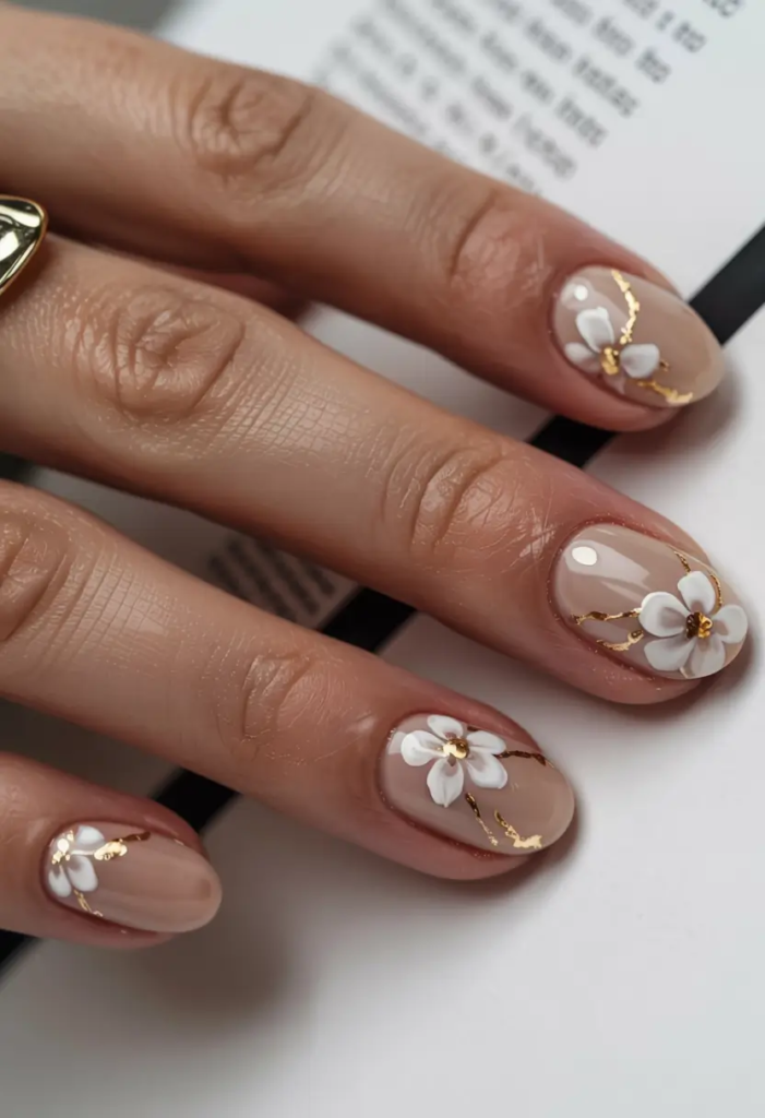 This style stands out because it uses sheer layers and delicate detailing. The gold lines and floral elements create a soft artistic effect without covering the natural nail too much. It feels light and modern.