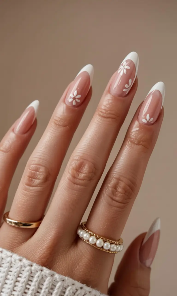 This style adds a small creative touch to a classic French base. The almond shape enhances the elegance, while tiny floral details make the design feel more personal.