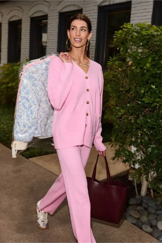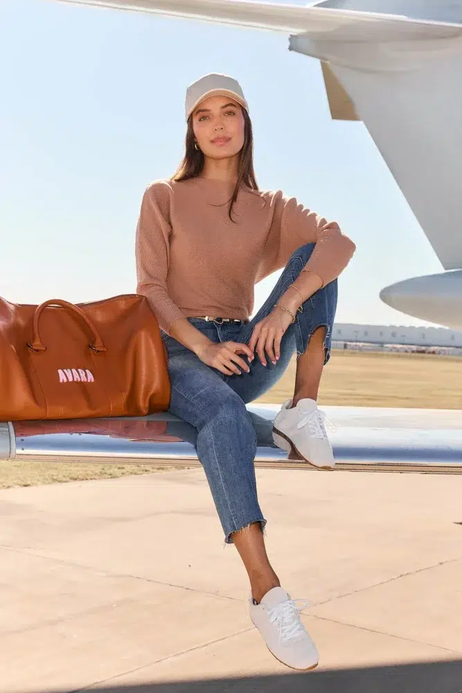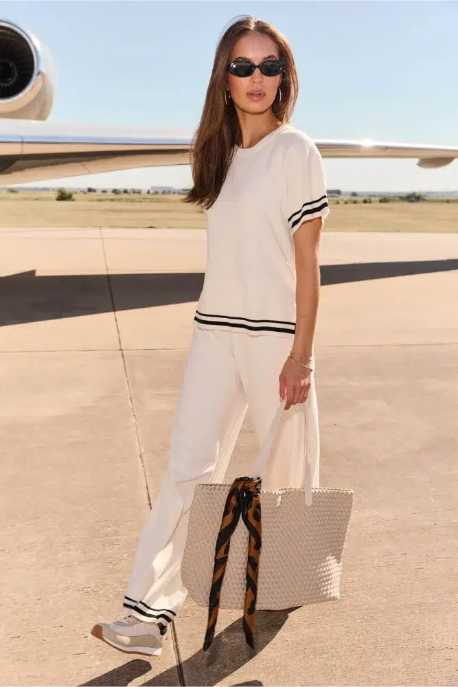 A matching knit set feels soft and cozy while giving a polished, coordinated look. It’s comfortable enough for long travel days yet still appears intentional and stylish.