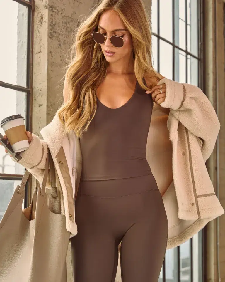 Pairing sleek activewear with a cozy sherpa coat blends warmth with style. It provides comfort while maintaining a polished appearance.