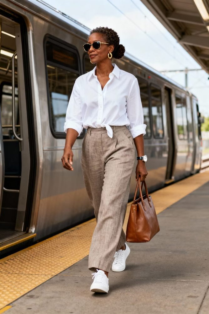 Linen pants with a button-up create a breathable, polished look. It exudes calm confidence and effortless style for travel.