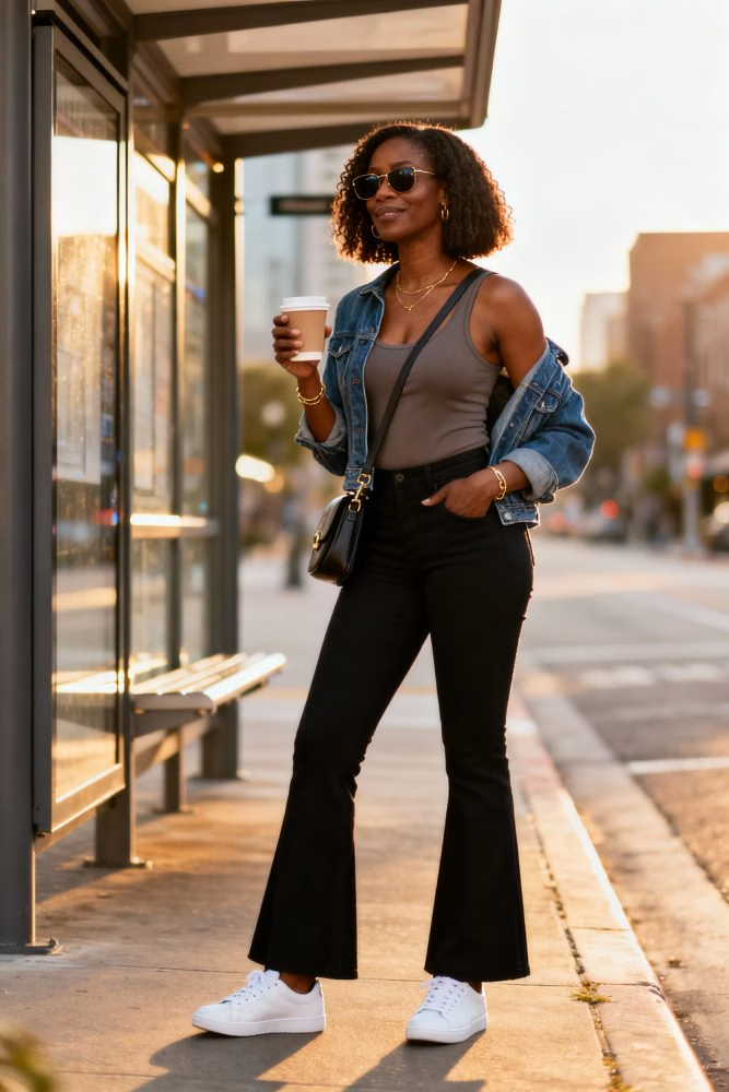 Layering a denim jacket over flare leggings and a tank creates a modern, comfortable travel outfit. It keeps the look intentional and stylish.
