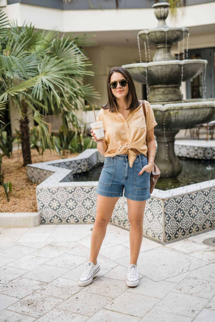 A tied linen shirt paired with medium-wash denim shorts creates a breathable and comfortable outfit ideal for warm weather. The waist tie adds shape, while the shorts maintain a classic casual foundation. Accessories like sunglasses and a structured bag bring subtle refinement to the look. This example shows how denim shorts outfits can remain simple while still appearing thoughtfully coordinated through fabric and fit choices.