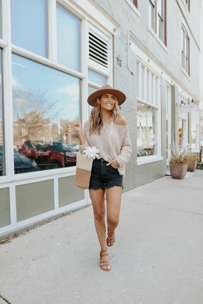 A soft off-shoulder sweater paired with black denim shorts creates a relaxed yet styled outfit suitable for casual city outings. The mix of textures adds depth, while accessories like a hat and tote elevate the overall look. Studded sandals contribute a subtle edge without overpowering the outfit. This shows how denim shorts outfits can transition easily into slightly dressier casual settings with the right complementary pieces.