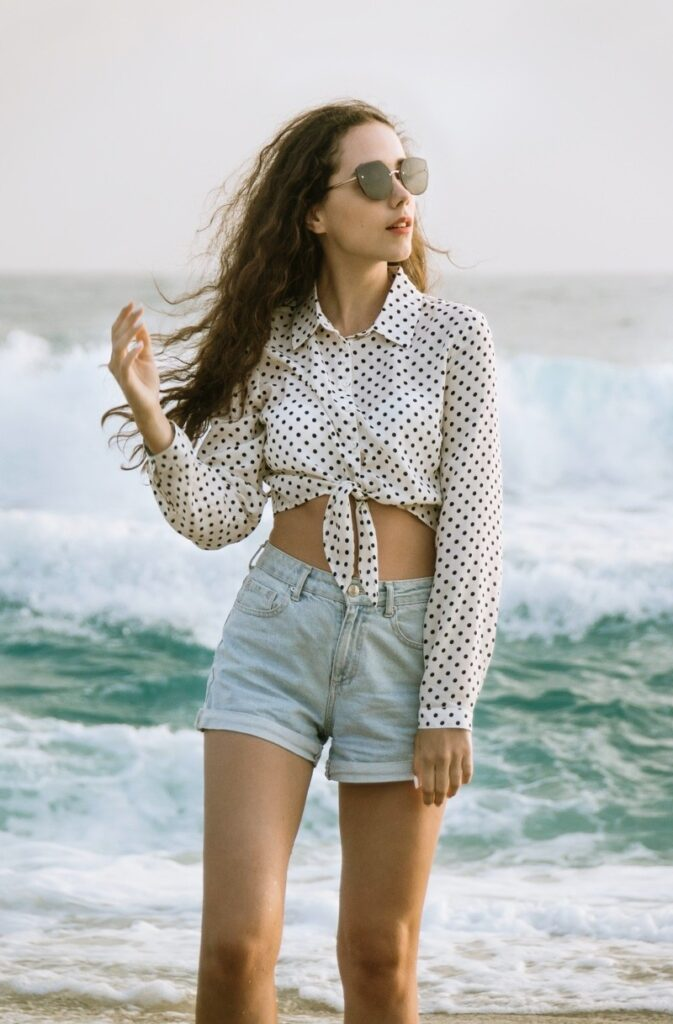 A tied polka dot shirt worn with light-wash denim shorts creates a playful and expressive outfit. The knot detail at the waist adds shape, while the print brings personality without overwhelming the look. Sunglasses and simple accessories complete the ensemble. This example highlights how denim shorts outfits can feel dynamic when incorporating patterned tops with simple styling techniques.