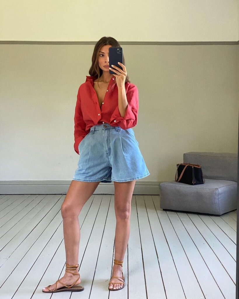 A bold red button-up paired with light-wash denim shorts creates a striking yet balanced outfit. The shirt’s color draws attention while the neutral shorts keep the look grounded. Accessories such as sandals and a structured bag help maintain a refined overall appearance. This combination shows how denim shorts outfits can stand out when a strong color is paired with simple, classic denim pieces.