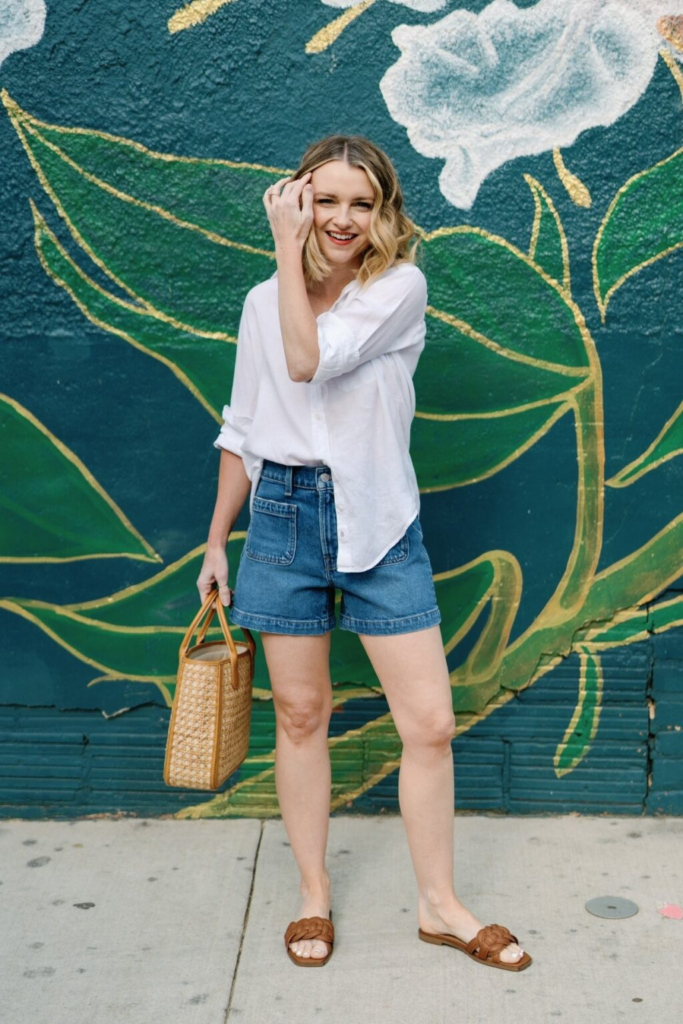 An oversized white button-down shirt tucked into denim shorts creates a structured yet relaxed outfit. Rolling the sleeves and leaving the collar slightly open enhances the casual feel while still appearing neat. Woven accessories like a basket bag and sandals complement the outfit’s light tone. This look illustrates how denim shorts outfits can achieve a polished finish through classic wardrobe staples and simple styling choices.
